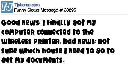 X Good news: I finally got my computer connected to the wireless printer. Bad news: not sure which house I need to go to get my documents.