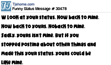- # 31056 Look at your status, now back to mine, now back to yours, now back to mine. Sadly, yours isn't mine. But if you stopped posting about other things and made this your status, yours could be like mine;)