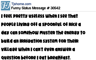 X  I feel pretty useless when I see that people living off a spoonful of rice a day can somehow muster the energy to build an irrigation system for their village when I can't even answer a question before I eat breakfast.
