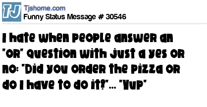 X I hate when people answer an "or" question with just a yes or no: "Did you order the pizza or do I have to do it?"... "Yup"