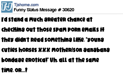 X I'd stand a much greater chance at checking out those spam porn emails if they didn't read something like, "young cuties horses XXX mother/son gangbang bondage erotica!" Uh, all at the same time, or...?