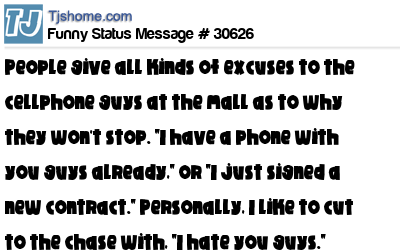 X People give all kinds of excuses to the cellphone guys at the mall as to why they won't stop. "I have a phone with you guys already," or "I just signed a new contract." Personally, I like to cut to the chase with, "I hate you guys."
