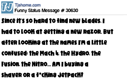 X Since it's so hard to find new blades, I had to look at getting a new razor. But after looking at the names I'm a little confused: the Mach 4, the Hydro, the Fusion, the Nitro... Am I buying a shaver or a f*cking jetpack?