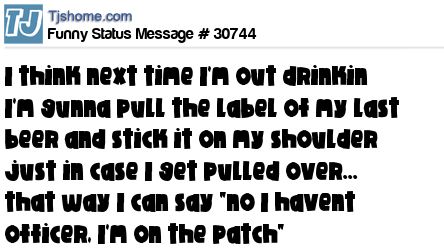 - # 40793 when you get pulled over for a D.U.I quickly pull off the lable off of the beer and stick it on ur forehead and tell the officer you havn't been drinking ur on the patch!"