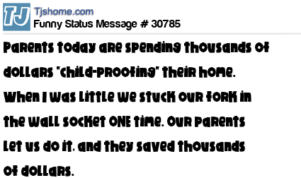 X Parents today are spending thousands of dollars "child-proofing" their home. When I was little we stuck our fork in the wall socket ONE time. Our parents let us do it, and they saved thousands of dollars.
