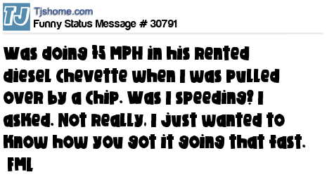 X is was doing 75 MPH in his rented diesel Chevette when I was pulled over by a Chip. Was I speeding? I asked. Not really, I just wanted to know how you got it going that fast. FML