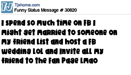 X i spend so much time on FB I might get married to someone on my friend list and host a FB wedding lol and Invite all my friend to the Fan Page lmao
