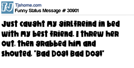 - # 109498 remembering that day when I caught my GF in bed with my best friend, I walked up to him, grabbed him by the collar and said "bad dog!"