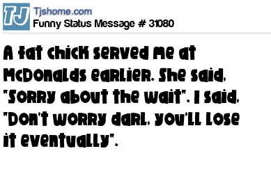 - # 79754 A fat girl served me in McDonald's at lunch time. She said 'sorry about the wait.' I said, 'Don't worry, you'll find a way to lose it eventually '