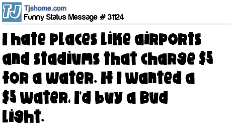 X I hate places like airports and stadiums that charge $5 for a water. If I wanted a $5 water, I'd buy a Bud Light.