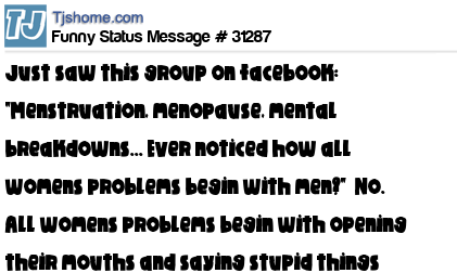 X Just saw this group on facebook: "Menstruation, menopause, mental breakdowns... Ever noticed how all womens problems begin with men?" No. All womens problems begin with opening their mouths and saying stupid things like that.