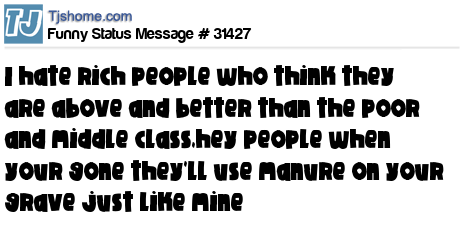 X is I hate rich people who think they are above and better than the poor and middle class,hey people when your gone they'll use manure on your grave just like mine