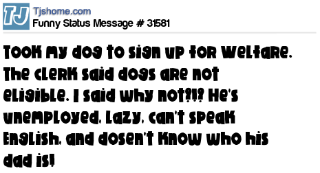 - # 17662 Took my Dog to sign up for Welfare. The Clerk said that Dogs aren't eligible. I said why not, the Dog is unemployed, Lazy, Can't Speak English and doesn't have a clue who his Dad is.