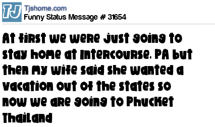 X At first we were just going to stay home at Intercourse, PA but then my wife said she wanted a vacation out of the states so now we are going to Phucket Thailand