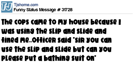 X is The cops came to my house because I was using the slip and slide and fined me..Officer said "sir you can use the slip and slide but can you please put a bathing suit on"