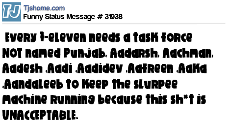 X is Every 7-eleven needs a task force NOT named Punjab, Aadarsh, Aachman, Aadesh ,Aadi ,Aadidev ,Aafreen ,Aaka ,Aandaleeb to keep the slurpee machine running because this sh*t is UNACCEPTABLE.