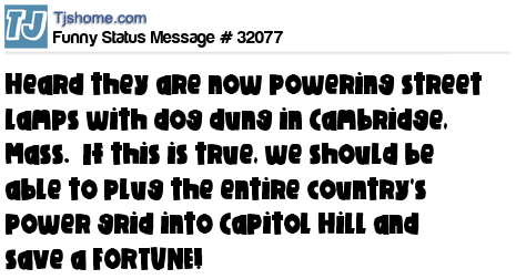 X heard they are now powering street lamps with dog dung in Cambridge, Mass. If this is true, we should be able to plug the entire country's power grid into Capitol Hill and save a FORTUNE!