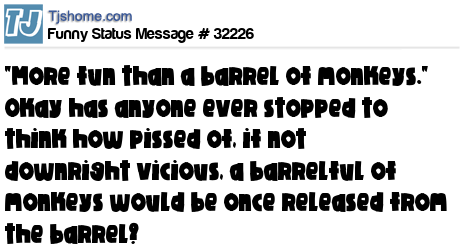 X "More fun than a barrel of monkeys." Okay has anyone ever stopped to think how pissed of, if not downright vicious, a barrelful of monkeys would be once released from the barrel?