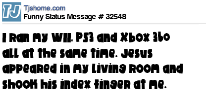 X is I ran my WII, PS3 and Xbox 360 all at the same time. Jesus appeared in my living room and shook his index finger at me.