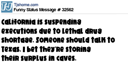 X is California is suspending executions due to lethal drug shortage. Someone should talk to Texas. I bet they're storing their surplus in caves.