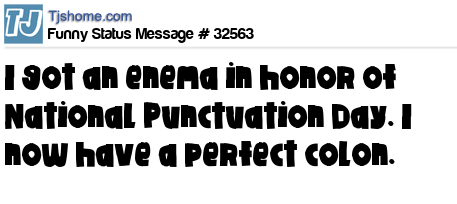 X is I got an enema in honor of National Punctuation Day. I now have a perfect colon.
