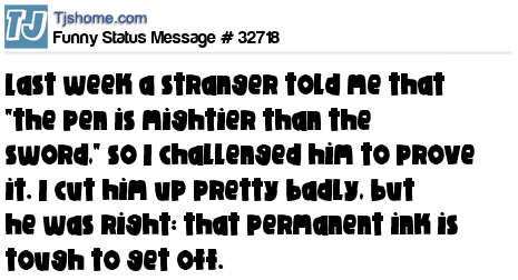 X Last week a stranger told me that "the pen is mightier than the sword," so I challenged him to prove it. I cut him up pretty badly, but he was right: that permanent ink is tough to get off.