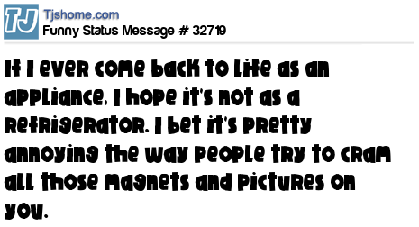 X If I ever come back to life as an appliance, I hope it's not as a refrigerator. I bet it's pretty annoying the way people try to cram all those magnets and pictures on you.