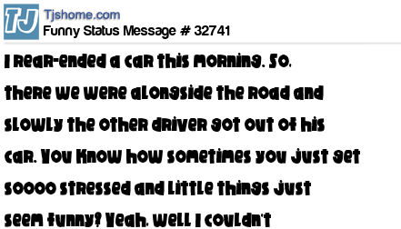 - # 28069 I rear-ended a car this morning. Slowly the other driver got out of his car. And he was a DWARF!!! He stormed over to my car, looked up at me, and shouted, "I AM NOT HAPPY!" So, I looked down at him and said, "Well, then which one are you,then?"