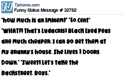X is "how much is an Eminem?" "50 Cent" "WHAT?! That's Ludacris! Black Eyed Peas are much cheaper. I can go get them at my granny's house. She lives 3 Doors Down." "Sweet! Let's take the Backstreet, Boys."