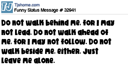 - # 38288 Do not walk behind me, for I may not lead. Do not walk ahead of me, for I may not follow. Do not walk beside me either. Just pretty much leave me the hell alone.