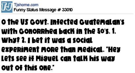 X is o the US Govt. Infected Guatemalan's with Gonorrhea back in the 50's. 1. Why? 2. I bet it was a social experiment more than medical. "Hey lets see if Miguel can talk his way out of this one."