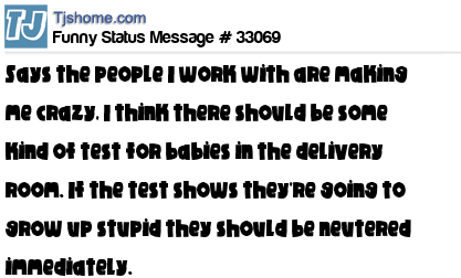 X is says the people I work with are making me crazy, I think there should be some kind of test for babies in the delivery room. If the test shows they're going to grow up stupid they should be neutered immediately.