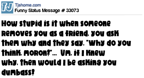 X says How stupid is it when someone removes you as a friend, you ask them why and they say, "Why do you think, moron?"... Um, if I knew why, then would I be asking you dumbass?
