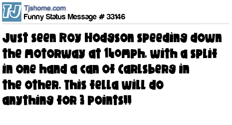 X has just seen Roy Hodgson speeding down the motorway at 140mph, with a splif in one hand a can of Carlsberg in the other. This fella will do anything for 3 points!!
