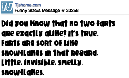 X says Did you know that no two farts are exactly alike? It's true. Farts are sort of like snowflakes in that regard. Little, invisible, smelly, snowflakes.