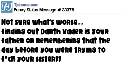 X  not sure what's worse.... finding out Darth Vader is your father or remembering that the day before you were trying to f*ck your sister??