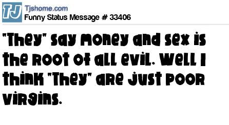 - # 67480 "They" say money and sex is the root of all evil. Well I think "they" are just poor virgins