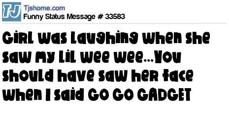 X is Girl was laughing when she saw my lil wee wee...You should have saw her face when I said GO GO GADGET