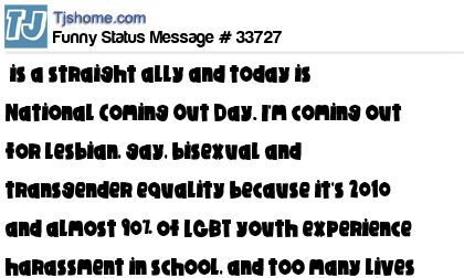 X is is a straight ally and today is National Coming Out Day. I'm coming out for lesbian, gay, bisexual and transgender equality because it's 2010 and almost 90% of LGBT youth experience harassment in school, and too many lives have been lost.