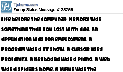 - # 48663 Life before the computer: Memory was something that you lost with age. An application was for employment. A program was a TV show. A cursor used profanity. A keyboard was a piano. A web was a spider's home. A virus was the flu. A CD was a bank account.