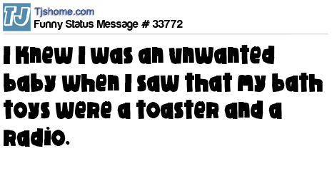 - # 10852 I knew I was an unwanted baby when I saw that my bath toys were a toaster and a radio.