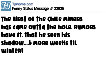 X says The first of the Chile miners has came outta the hole, rumors have it, that he seen his shadow....6 more weeks til winter!
