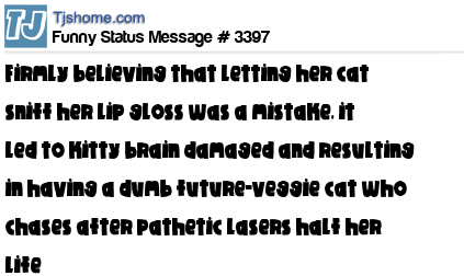 X is firmly believing that letting her cat sniff her lip gloss was a mistake, it led to kitty brain damaged and resulting in having a dumb future-veggie cat who chases after pathetic lasers half her life