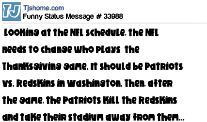 X says looking at the NFL schedule, the NFL needs to change who plays the Thanksgiving game. It should be Patriots vs. Redskins in Washington. Then, after the game, the Patriots kill the Redskins and take their stadium away from them...