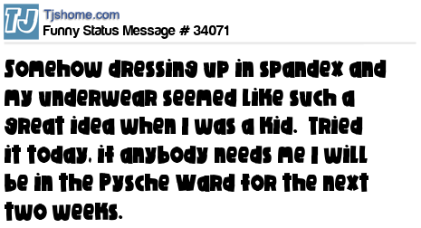 X somehow dressing up in spandex and my underwear seemed like such a great idea when I was a kid. Tried it today, if anybody needs me I will be in the Pysche Ward for the next two weeks.