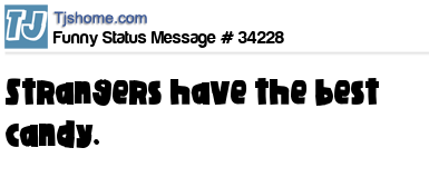 - # 153402 Okay kids don't ever talk to strangers or take candy from strangers or go to stranger's houses except on the day we worship the devil.
