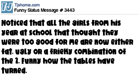 X has noticed that all the girls from his year at school that thought they were too good for me are now either fat, ugly or a frieky combination of the 2. Funny how the tables have turned.