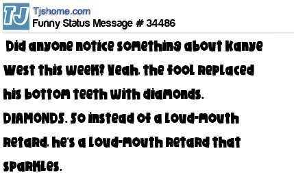 X Did anyone notice something about Kanye West this week? Yeah, the fool replaced his bottom teeth with diamonds. DIAMONDS. So instead of a loud-mouth retard, he's a loud-mouth retard that sparkles.
