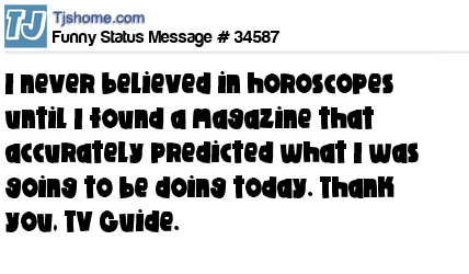 X I never believed in horoscopes until I found a magazine that accurately predicted what I was going to be doing today. Thank you, TV Guide.