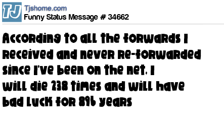 X says According to all the forwards I received and never re-forwarded since I've been on the net, I will die 238 times and will have bad luck for 896 years